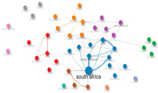 Diagram depicting the country collaboration network in LWE and SFS research (generated using the R-bibliometrix tool developed by Aria and Cuccurullo []).