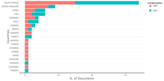 The growth of research collaboration is gaining traction in Africa and the world at large with the eminent aim of pooling human, financial, and material resources to solve common challenges that have become global issues. Nevertheless, based on the 73 analysed articles, Figure 11 and Figure 12 show a tendency for African researchers to collaborate with researchers in the global North rather than the global South. For instance, Figure 11 reveals several clusters showing the fragmentation of research collaboration between African countries and nations in the global North. The outcome revealed the domination of international researchers in the research collaboration, which supported the assumption that African researchers tend to collaborate more with international researchers than their colleagues in Africa [], which was also corroborated by the findings in Figure 12. This was due to the fact that research growth in Africa faces impediments, primarily categorised as institutional and individual factors. The institutional challenges encompass restricted funding, inadequate support and collaboration networks, government disinterest in research, and a deficiency in mentorship. Conversely, individual hindrances involve low self-motivation, limited research capacities and self-efficacy, and a burdensome workload [,,]. Furthermore, South Africa, which has led multiple collaboration publications (MCPs) as shown in Figure 12, indicated a significant level of researcher collaboration both within Africa and internationally. In contrast, Rwanda and Tunisia, identified by single collaboration publications (SCPs), suggested limited external collaboration among their researchers.