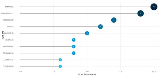 This section discusses scientific production on the LWE and sustainable food systems research area with the aim of identifying the lead authors and countries in this thematic area. It is very important to identify the lead authors of African origin to encourage them to take up the responsibility of promoting the African perspective as well as accelerating research collaboration amongst African scholars in this area of research. The ten most published authors in order of merit, as denoted in Figure 13, include Nhamo L., Mabhaudhi T., Mpandeli S., Modi A., Naidoo D., Hirwah F., Muhirwa F., Senzanje A., Conway D., and Elshkaki A. Furthermore, the country scientific production, as depicted in Figure 14, buttresses the fact that South African institutions are dominating the research in this thematic area in Africa while, on the other hand, painting the dominance of foreign nations in Africa-based research. Moreover, the grey colour represent countries which have not conducted any research in LWE nexus and SFSs.