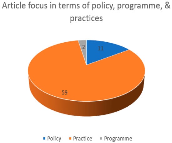 In addition to analysing the LWE/WEF research productivity in Africa in the preceding sections, this section discusses how the LWE/WEF nexus approach has evolved qualitatively in terms of thematic coverage. The thematic analysis was done based on the application of some components of the FSNet framework, as explained in the methods section. The LWE research attention on policies, programmes, and practices in addition to specific thematic areas were examined to ascertain the extent to which the existing research covered these thematic areas. Figure 15 depicts a larger focus on LWE/WEF practices and a marginal focus on policies and programmes. In other words, a significant portion of LWE/WEF research focuses on implementing or putting into practice this approach for attaining sustainability in agriculture, enhancing food security, optimising food systems, and managing resources.