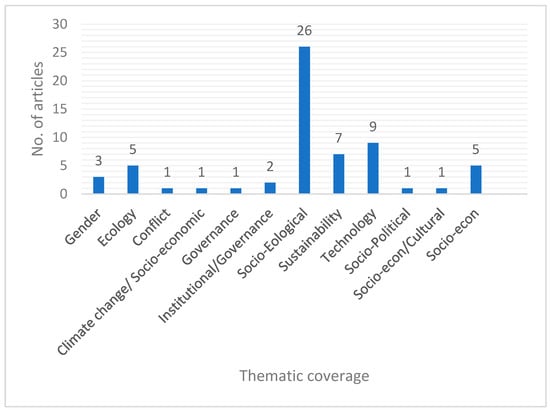 The content review of the articles’ thematic coverage (Figure 16) revealed a dominance in socio-ecological research. Research within the socio-ecological perspective primarily centered on the examination of social factors. These factors included the effects of population growth on the operationalization of the nexus, the consequences of energy policies on land availability for human well-being, as well as the socio-economic and environmental challenges associated with the implementation of nexus programs. In addition to the research concentrated on sustainability and technology, there was a notable scarcity of research in several vital thematic areas. These areas included conflicts, governance, gender, policies, socio-political dimensions, and culture. These gaps aligned with the findings from the bibliometric analysis.