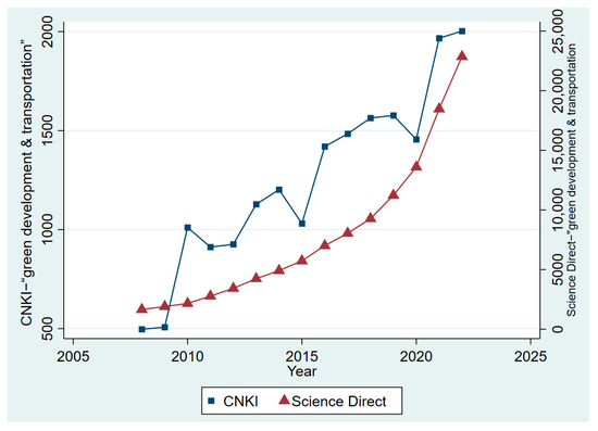 In the current scenario, where transportation predominantly contributes to extreme pollution, energy-consuming nations are continuously striving to find ways to ensure environmental sustainability. The transportation sector, a critical link between a nation’s production and consumption, is also one of the primary sources of energy consumption and carbon emissions. Since 2017, the transportation sector has emerged as the world’s second-largest contributor. Despite a decrease in residents’ travel needs due to the significant global public health event in 2020, energy consumption in the transportation field still accounted for about 26% of the total in 2022 [1], and carbon emissions amounted to approximately 21% (as shown in Figure 1) [2]. Projections by the IEA suggest that, by 2030, the share of CO2 emissions from all sectors might rise to 50%, and, by 2050, it is expected to reach 80% [1]. Experiences from developed countries indicate that only with the transportation sector’s synchronous development with the economy can the overall advantages and comprehensive benefits of the transportation system be fully realized, elevating the level of transportation development to new heights [3]. Simultaneously, the ‘Green Economy Blue Book’ points out that ‘green development’ represents a more resource-efficient, cleaner, and recoverable state of development, an active interaction between ‘economy-nature-society’ [4], and a state of balance between resources, environment, and economic development [5]. With the rapid growth in emerging industries, such as ride-hailing services, shared bicycles, and online freight platforms, low-carbon production and lifestyles in the transportation sector are gradually taking shape. Additionally, virtual reality technology has also been substantiated as a mitigating factor for the downturn in the tourism industry during the COVID-19 pandemic by altering consumer patterns [6]. Furthermore, it facilitates addressing the challenges of sustainable development in urban transportation [7]. This impact persists into the post-pandemic era, indicating a paradigm shift in the transportation sector. The concept of green development has permeated various dimensions of the transportation sector, redirecting its developmental trajectory. The sector is increasingly prioritizing quality and efficiency of development over mere speed and scale. A search in CNKI and Science Direct using relevant keywords reveals a significant increasing trend in research on green development in the transportation field across various countries (as shown in Figure 2), yet there is still vast room for research.