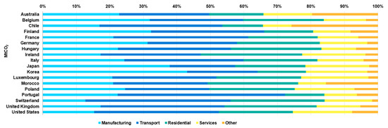 The global transportation industry continues to face immense pressure to reduce emissions, particularly those of energy consumption and carbon emissions. Figure 3 shows the variations in CO2 emissions from the transportation sectors of 18 typical economies [1,8,9,10]. Represented by the United States, France, Germany, Portugal, and the United Kingdom, the CO2 emissions from the transportation sectors of many countries occupy a relatively large share of their total energy consumption carbon emissions, especially in the United States, where it accounts for 33% of national carbon emissions. Meanwhile, for many EU countries in the middle to late stages of industrialization, with relatively stable transportation service development, the transportation sector has become the only sector with continuous growth in carbon emissions. Therefore, the development of this global high-energy-consuming industry—the transportation sector—should adapt to various urbanization needs and simultaneously reduce its negative impact on the environment to achieve ecological sustainability [11]. Global research has progressively confirmed the correlation between transportation and green development, with an increasing number of studies emphasizing the construction of more comprehensive and integrated approaches to understand the significance of achieving green development in the transportation sector.