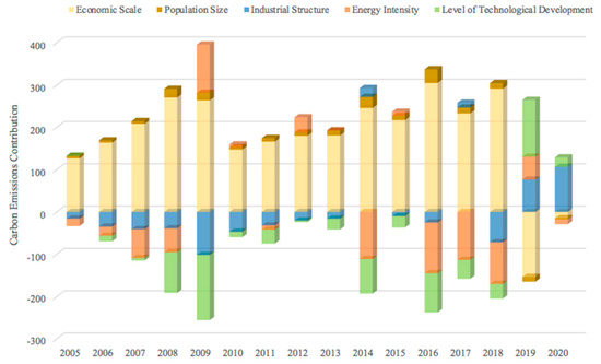 Identifying key factors influencing green efficiency in the transportation sector is critical for formulating development strategies that yield both environmental and economic benefits. Although the focus varies among countries, commonly, factors influencing industrial green development are screened from three aspects: industrial scale, structure, and technological innovation [58,59,60,61,62,63]. Taking China’s 30 regions as an example, Figure 4, influenced by regional heterogeneity, reveals significant differences in undesired outputs, specifically carbon emissions, across different regions. Simultaneously, using transportation data from 2005 to 2020, the impact proportion of each factor on the total effect was analyzed. Figure 5 indicates that the scale effect plays the most pronounced role in promoting carbon emissions, while structural and technological effects tend to suppress emissions, with the impact of industrial structure being more significant. Explanations for these various influencing factors are provided in the following text.