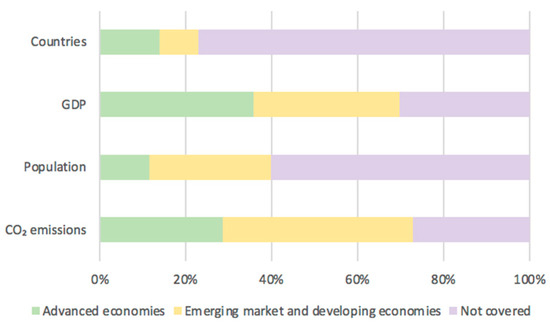 For most developing countries and some developed nations, scale effects trigger expansions in population size, per capita GDP, transportation infrastructure scale, and economic scale. Consequently, energy consumption and carbon emissions increase with expanding scale, hindering the green development of the sector to some extent [64,65,66,67,68,69,70,71]. Specifically, in the past 30 years, the transportation sector in developed countries has generally had higher total and per capita carbon emissions compared to developing countries. Hence, nations can be categorized into ‘advanced economies’, ‘emerging markets and developing countries’, and ‘others’. Figure 6 displays typical indicators affecting the scale effect of these three categories and their shares of carbon emissions, revealing a direct correlation between larger GDP and population size and higher carbon emissions [1]. However, due to the difficulty in rapidly adjusting indicators, like economic development level and population size, the restraining effect of scale expansion on energy conservation and emission reduction in the transportation sector remains significant.