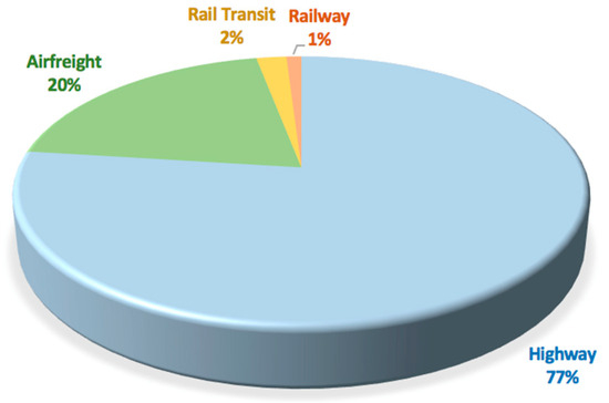 Moreover, optimizing transportation intensity and service structures related to industrial development also serves as an effective means to curb energy consumption and carbon emissions [72,73,74,75]. Road transportation, which accounts for approximately three-quarters of the total carbon emissions from the transportation sector, is key to achieving the sector’s zero-carbon goal [76,77]. Figure 7 reveals that road transport, including passenger and freight, contributed 77% to the global transportation sector’s carbon emissions in 2021, with the remainder emanating from the aviation, maritime, and rail sectors. According to data from the International Energy Agency shown in Figure 8, road transportation indeed generates significantly higher CO2 emissions compared to other modes of transport [1]. Therefore, identifying the optimal transport mix and clarifying the optimal transport modal split will be key to curbing energy consumption and emissions.