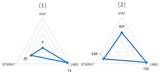 Identifying and quantifying the various factors influencing the green development of the transportation sector is crucial for prioritizing development strategies. Factor decomposition methods have been widely acknowledged by scholars globally. Initially, the IPAT model demonstrated that population, affluence, and technology are the three primary factors affecting environmental conditions and industrial development [99]. The stochastic environmental impact assessment model (STIRPAT) strictly constrains the measurement of the degree of influence of various factors, such as population, level of economic development, energy efficiency, transportation structure, and level of urbanization, on the carbon emissions of the transportation industry in different environmental contexts [92,100,101,102,103,104]. It overcomes the limitation of the IPAT model, which relies on the equal proportional influence of variables, because it is easier to obtain quantitative relationships between variables. However, this method still suffers from a lack of flexibility. Additionally, the structural decomposition analysis (SDA) method based on the input–output model [89] and the production theoretical decomposition analysis (PDA) method [91] are frequently used to discuss the impacts of industrial scale, structure, and technology effects on carbon emissions. Nevertheless, these methods fall short in precisely measuring structural factors, like economic structural effects and energy consumption, potentially leading to conclusions contrary to actual situations. In such cases, the index decomposition analysis (IDA) method based on time series data is widely used. Furthermore, the logarithmic mean divisia index (LMDI) decomposition method, known for its simple decomposition form, independence from the decomposition factors, and zero residual in decomposition results, effectively addresses the zero-value problem and has become one of the preferred choices in resource and environmental research [87,93,97]. The frequency of three types of factor decomposition models used in green development research in the transportation sector, as found on China National Knowledge Infrastructure (CNKI) and Science Direct, is illustrated in Figure 9. However, in using factor decomposition methods to identify key factors and measure their impact, the autocorrelation among factors and regional spatial autocorrelation are often overlooked. Future research should focus on enhancing the application of spatial econometric models and constructing hybrid models to improve analytical accuracy. This will assist different regions in the transportation industry to better formulate energy-saving and emission-reduction policies.