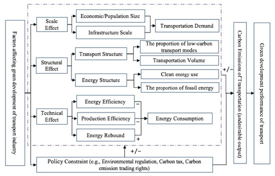 Structural effects are primarily manifested in the impacts of transportation and energy structures. As a critical input indicator in assessing green efficiency in the transportation sector, the proportion of fossil fuels in energy consumption alters the sector’s energy structure [102]. An increased proportion of high-carbon-emitting sources, like coal, gasoline, and diesel, diminishes carbon emission efficiency [98,109]. Thus, the vigorous promotion of green travel concepts, along with the proliferation of clean energy and public transportation modes, has increased the proportion of low-carbon travel, subsequently enhancing the sector’s green efficiency [110,111]. Moreover, the development of the transportation sector promotes effective resource redistribution, reducing the proportion of ‘high pollution, high emission’ industries in primary and secondary sectors. However, improvements in the service quality of the transportation sector may transfer high energy consumption and pollution characteristics to the sector, potentially exerting adverse impacts on its green development [108,112]. Therefore, as the proportion of service industries, like transportation, increases, the expansion of manufacturing economies indirectly drives up demand in the transportation sector. Structural optimization also faces the risk of stimulating industrial scale, thereby promoting energy consumption and carbon emissions.