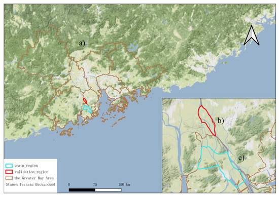 The study area: (a) the Guangdong-Hong Kong-Macao Greater Bay Area (GBA); (b) the model accuracy validation region; and (c) the model training region.