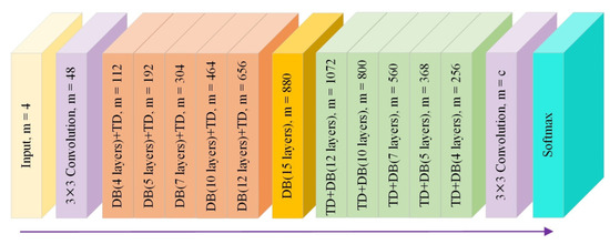 DenseNet is used not only for data classification but also for image super resolution and image segmentation. The advantages of DenseNet are the elimination of the gradient vanishing problem and enhanced feature propagation. A large number of features are multiplexed, which can effectively reduce the parameters of the model. The DenseNet network is designed with densely connected blocks, resulting in a narrower architecture with fewer parameters. This design optimizes the efficiency and effectiveness of feature transfer, allowing for more effective and complete utilization of features while reducing the issue of gradient disappearance. As a result, the network exhibits exceptional capability in feature extraction. Fully Convolutional DenseNet103 (FC-DenseNet103) [39] is an extension of a densely connected convolutional network (DenseNet) [40], which contains 103 convolutional layers. FC-DenseNet103 is primarily utilized for label-based feature extraction and semantic segmentation. The key process involves incorporating down-sampling and up-sampling functions behind the dense block. As shown in Figure 2, the structure of the FC-DenseNet103 model network consists primarily of Full Convolution DensNet (including Dense Blocks and Transition Down Blocks), Bottleneck Blocks, Dense Blocks add Transition Up Blocks, and Pixel-Wise Classification layer. The dense module/Dense Blocks (as shown in Figure 3) performs convolutional operations, while concatenation combines the outputs of each layer in the dense module.