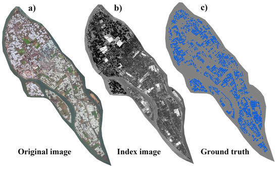 Example for the GF-2 satellite image: (a) original image, (b) index image, and (c) ground truth.