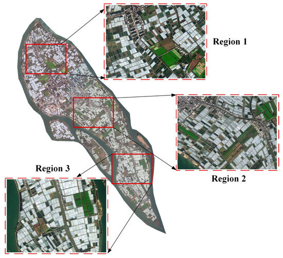 Locations of the three regions for displaying the performance of different methods in extracting plastic greenhouses.