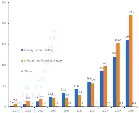 Prediction of power battery retirement scale in China, 2021–2030. (Data source: Asset information network https://www.zichanxinxi.com/ (accessed on 12 August 2023)).