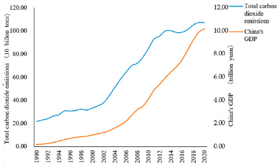 Carbon dioxide emissions and GDP trends in China. (Data source: The World Bank makes the data publicly available https://data.worldbank.org.cn/ (accessed on 7 October 2023)).