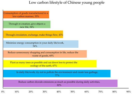Low-carbon lifestyle of Chinese young people. (Data source: WIETOP: Quantitative research on low-carbon people https://wietop.com/ (accessed on 26 October 2023)).