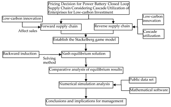 Today, with the number of waste power batteries and consumers’ awareness of low-carbon both increasing, a new closed-loop supply chain model in which the node enterprises of reverse supply chains are being constructed. These are responsible for the recycling, echelon utilization and low-carbon innovation of waste power batteries. This provides a new way for the development of reverse supply chain node enterprises and lays a theoretical foundation. In this paper, we use the backward solution method to solve the Nash equilibrium solution of the Stackelberg game. Through numerical calculation and simulation, the decision variables, profit and income of the supply chain are analyzed and the equilibrium results are compared. The experimental results indicate that the implementation of low-carbon innovative production by cascaded utilization enterprises is conducive to the growth of their profits with lower cost inputs. The impact of the initial waste power battery recycling rate on the decision variables is negative, while, for the supply chain as a whole, the profit growth of the node companies can be positive and the location of the inflection point appears to be particularly important. The sensitivity coefficient of low-carbonization levels has a positive regulatory effect on decision variables and location of all parties. The closed-loop supply chain model proposed in this study promotes the overall development of a power battery closed-loop supply chain, and also provides theoretical guidance for reasonable pricing decisions of node enterprises under the new model. Based on the results of this paper, the government can implement incentives such as subsidies, or formulate reasonable policies for the development of a power battery closed-loop supply chain.
