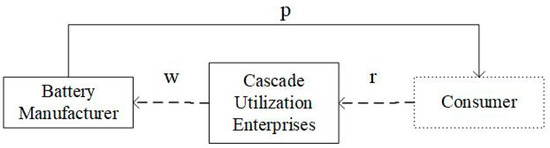 The decision-making process of the low-carbon closed-loop supply chain for power batteries proposed in this article that as the leading supplier in the supply chain, power battery manufacturers determine the retail price of power batteries . The manufacturer sells new power batteries to consumers, and the secondary utilization enterprise is responsible for recycling waste batteries and conducting low-carbon treatment before reselling them. Cascade utilization enterprises determine the level of low-carbon reuse investment and sell low energy storage power batteries to consumers at a price of . Assuming that all the reused power batteries are recycled and the power battery manufacturer extracts all of them for raw materials and re-inputs them into the manufacturing of new power batteries.