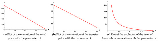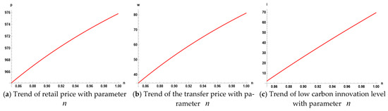 Further observation shows that the range of change in the low-carbon production cost coefficient is set to . As it increases, the enterprise’s low-carbon level changes the most, followed by the transfer price of waste power batteries, and the wholesale price of manufacturers changes the least.