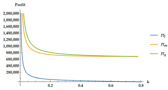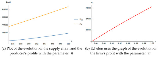 Figure 14 shows that as the sensitivity coefficient of the low-carbon level of the cascade utilization enterprise increases, the profits of member enterprises and the overall profits of the supply chain also decrease. Verified the two conclusions and in Proposition 3. On the premise that the parameter settings meet the optimal equilibrium solution of the model, the overall profit of the supply chain is higher than that of the member enterprises. Figure 7 shows that when the cost coefficient of low-carbon production is small, the curve changes quickly, and the profits of the three parties decrease significantly. When the cost coefficient of low-carbon production is large, the curve changes slowly, and the profit reduction of the three is relatively small. Cascade utilization enterprises, as implementers of low-carbon production, should minimize the cost of low-carbon investment through integration of industry, academia, and research, or the introduction of advanced technology, while enhancing the level of low-carbon innovation, in order to maintain a relatively good level of revenue for supply chain node enterprises and the overall supply chain.