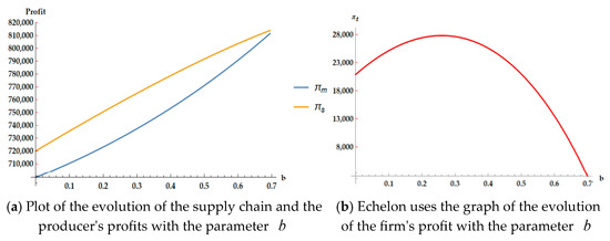 The following simulation analysis shows the impact of the cost coefficient of low-carbon production on the profits of member enterprises and supply chains, as shown in Figure 14.