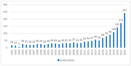 The changing trend of the number of publications related to the topic can reflect the development speed and research heat of the topic in a certain period of time. The changing trend in the number of papers related to the topic can reflect the development speed and research enthusiasm of the topic in a certain period of time. Through the statistics of the annual number of papers, we can grasp the development stage and changing trend as a whole.