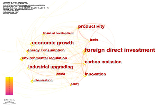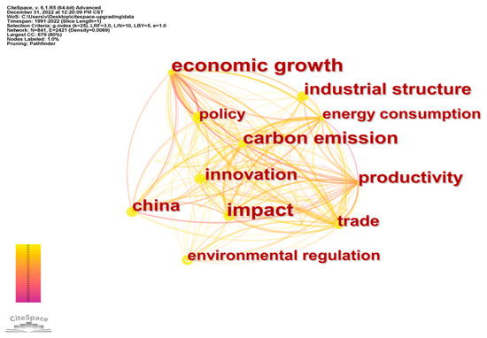 Among all clustering labels in Table 4, the label “#0 global value chain”, which contains the most articles, has 340 articles, which is the largest cluster in this cluster. This cluster erupted in 1995. The keyword is “economic growth”. It indicates that extending the domestic links of the global value chain, cultivating the connection and connection between the global value chain and the domestic value chain, and constructing the chain-to-chain competition may provide a solid division of labour foundation for the industrial upgrading of the country and the coordinated development of regional economy. The earliest label “#1 carbon emissions” appeared in 1992. The keyword “impact” indicates that promoting carbon emission reduction and industrial upgrading have a mutual influence on each other. At the same time, labels “#3 energy efficiency, #4 biogas upgrading, #10 wastewater treatment” and keywords “industrial structure, productivity, energy consumption” help analyse industrial upgrading from the perspective of energy. Industrial upgrading can reduce carbon emissions, while industrial structure upgrading and economic development model transformation are also some of the most effective ways to promote carbon emission reduction. The keywords of tags “#5 green finance, #7 industrial structure rationalization, #8 structural change” are “innovation, trade, policy, and environmental regulation”, which discusses industrial upgrading from the perspective of economic growth. In the capitalist market economy, economic growth is mainly manifested in the opening of the market, and industrial upgrading can only be produced by pursuing the maximization of the added value of products. The keywords “China, regulation” of the labels “#6 environmental regulation, #9 evolution”, although industrial upgrading is an economic discipline, are also political concepts, which need corresponding supporting policies. From the cluster analysis of keywords, it can be clearly seen that scholars’ research hotspots in the field of “industrial upgrading”, and through further analysis of the hot words with the highest frequency under the keyword cluster label, the main key points of scholars’ research in this field, and the evolution path of research hotspots are sorted out.