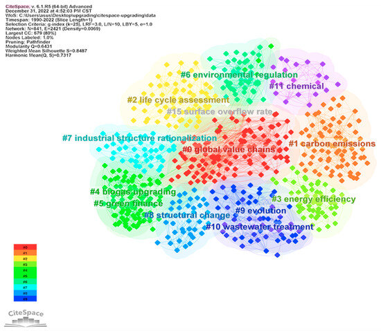 As shown in Figure 4, we obtained 841 nodes and connections among 2421 nodes. This means that 841 keywords are obtained according to the operation, and there are 2421 co-occurrence relations between the keywords. In this network diagram, every node is a centre, representing a keyword. Every keyword plays a pivotal role in connecting each article. The larger the node is, the stronger the pivotal role and centrality are, and the more important the keyword is in this visual network. Similarly, the size of the keyword font is proportional to its frequency of occurrence. The thickness of the line between each node represents the closeness of the connection between each keyword. The thicker the line, the more times the two keywords appear in the same article and the stronger the co-occurrence. The colour on the top corresponds to the year. From left to right, they go from 1991 to 2022. The colour on the bottom corresponds to the time when the keyword first appeared and the frequency of occurrence in the following years. Figure 4 shows that the two node icons of “economic growth” and “impact” are the largest and most core keywords. It is quite consistent with the study of “industrial structure has an impact on the economy” in this paper. The next big icons are carbon emission, industrial structure, productivity, innovation, etc. We can see that these keywords are also the research focus in this field. Moreover, it can be seen from the colour that the research development in this field has been the most prosperous in recent years, and the co-occurrence of many keywords also appeared in the last decade. In order to further analyse these 841 keywords, the Log Likelihood Ratio (LLR) algorithm is used to cluster keywords via CiteSpace information visualization software. The clustering index of Modularity Q (network modularity index) is 0.527 > 0.3 and the Mean silhouette (network homogeneity index) is 0.7699 > 0.7, which proves that the obtained clustering results are good. In order to focus on the analysis, the obtained keyword clustering results were screened, and the top 10 most important keywords clustering were selected. The papers contained in these 10 tags account for 80% of the total papers, indicating a high degree of concentration on research topics.