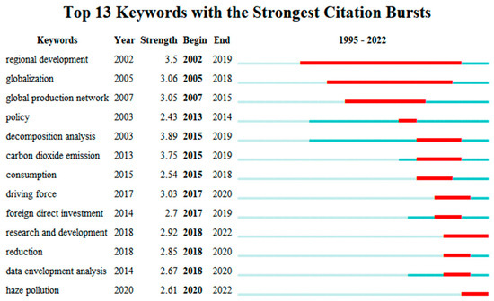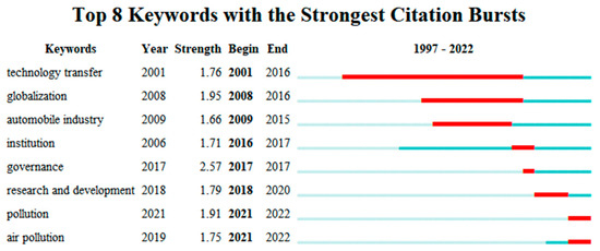 The emergent word algorithm is aimed at the calculation of the sudden increase of scholars’ interest in a certain aspect of research in a specific field. It extracts “emergent word” from a large number of texts by investigating the change characteristics and time distribution of the word frequency of specific words in the contained text content rather than simply analysing its word frequency [45]. Compared with the analysis of common high-frequency words, the analysis of emergent words is more helpful in understanding the development trend and research frontier of a certain field. In this study, the CiteSpace information visualisation software is used to continue the operation on the basis of the previous clustering, and each cluster is automatically identified to extract the outburst words. Supplemented with the timeline graph, Figure 10, Figure 11, Figure 12, Figure 13 and Figure 14 are obtained. Blue colors present the emergence start and end years, and red colors present emergence intensity of major emergent words.