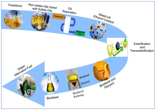 Biodiesel is an alternative fuel that can be derived from vegetable oils. Other alternative fuels include vegetable oil micro-emulsions, pyrolysis products of vegetable oils, and vegetable oils mixed with diesel oil. Methyl and ethyl esters can also be produced from vegetable oil or animal fat. In addition, biodiesel can also be produced from mixed vegetable oil, such as waste cooking oil, palm oil, Jatropha seed oil, castor oil, peanut oil, soybean oil, and algal oil [27]. Moreover, biodiesel can be used pure, as B100, or blended with diesel fuel with the blend denoted as BXX, in which XX is the biodiesel percentage in the blend. Hence, the most common ratio is B20, which is 80% diesel and 20% biodiesel [21].