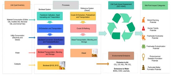 A comprehensive analysis of the environmental impacts of gasoline, diesel, and biodiesel using the LCA reveals that biodiesel significantly reduces greenhouse gas emissions compared to traditional fuels. However, it also increases particulate matter (PM10) emissions, nitrous oxide, nitrogen oxides (NOx), and nutrients that contribute to eutrophication [61]. This balanced view is essential for planning a sustainable transportation system, considering both the environmental benefits and the challenges of biodiesel. Transportation companies in Malaysia need help for adopting biodiesel [62]. A differentiation strategy could help policymakers promote biodiesel usage more effectively by addressing identified barriers [63].