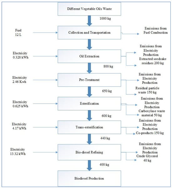 Life cycle inventory (LCI) is the second step in the analysis of LCA, which consists of measuring field data for which all the inputs and outputs of the system are considered and calculated. The data needed for biodiesel production include the production and composition of mixed vegetable oil, emission factors, fuel needs, and electricity requirements. In addition, the data obtained from the Gabi software serve as a basis for building the system model of the process. The system boundary, waste flow with mass balance, electricity consumption, and fuel requirements are shown in Figure 4.