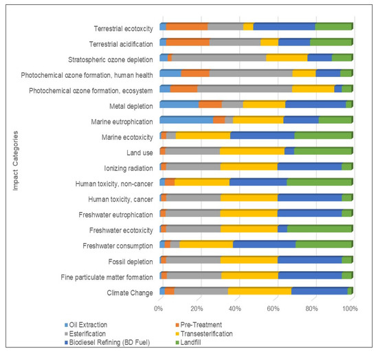 Biodiesel production contributes to a decrease in pollutant emissions without causing an increase in greenhouse gas (GHG) emissions. Consequently, several studies have indicated that burning can elevate the concentration of CO2 in the atmosphere. However, carbon absorption throughout a plant’s life cycle can offset this increase in emissions [33]. The GWP of the biodiesel process is 136 × 10−4 kg CO2 eq. Eutrophication (freshwater or marine) is aquatic nutrient enrichment brought on by H3PO4 and PO43−; it causes environmental deterioration. The NP is measured in kg P or N eq. and primarily from landfill or diesel emissions. As a result, open burning emits pollutants into the atmosphere, which eventually settle with rain [44]. Emissions from sedimentation raise the productivity and nutrient levels in water bodies. Thus, algae absorb nutrients that are needed by other aquatic organisms [45]. Eventually, they are decomposed by bacteria and all die. This situation leads to a decrease in the level of DO as the amount of oxygen available to living aquatic organisms decreases [8]. The marine eutrophication of the process is 0.134 kg N eq., and the freshwater eutrophication is 0.0118 kg P eq.