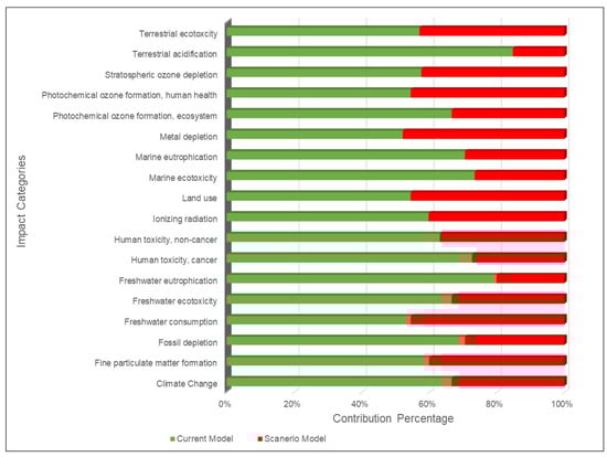 In this context, the study’s system boundary is gate-to-gate, and the FU is set at 1 ton of mixed vegetable oil waste. Our analysis of the results employs the ReCiPe Midpoint (H) LCIA method. The data on the quantity, materials, fuel, and energy consumption of the mixed vegetable oil waste were collected from the published literature on the country’s overall production of biodiesel [43]. However, the other data (the electricity emissions) were taken from the database. Hence, the LCIA results are converted into impact categories (classification). The classified results are collected for each category indicator (characterization). The ReCiPe methodology used in this study is the follow-up of CML 2002 and Eco-indicator 99 methodologies. The indicator scores are measured in the same way as the Eco-indicator 99 methodology, and this approach uses both midpoint and endpoint modelling [11]. In addition, it is a coordinated LCIA method at a midpoint level [23]. It covers 18 midpoint impact categories, including ozone formation (terrestrial ecosystems, human health), ozone depletion, marine ecotoxicity, freshwater ecotoxicity, human toxicity (cancer, non-cancer), terrestrial acidification, terrestrial ecotoxicity, land use and water consumption, fossil depletion, climate change, ionizing radiation, resource depletion, fine particulate matter formation, and marine eutrophication. The endpoint indicators are mainly grouped into three main categories: ecosystems, resources, and human health.