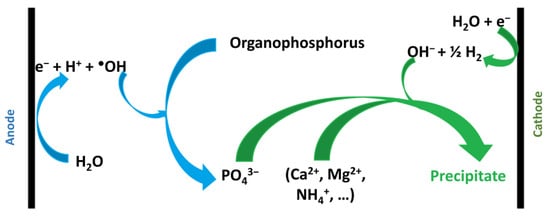 The conversion of organic phosphorus to orthophosphate can be carried out in many ways, e.g., through ozone, microwaves, ultraviolet radiation, electrochemical oxidation, etc. [,,,]. In the particular case of electrochemical oxidation, the organic phosphorus is oxidized to orthophosphate, which can then be recovered []. This process is based on the generation of hydroxyl radicals (OH•), which present one of the highest standard oxidation–reduction potentials (2.8 V vs. SHE) []. Despite the two-step process, phosphorus recovery needs only a single reactor, as the oxidation of organic phosphorus occurs at the anode and the orthophosphate precipitation occurs at the cathode (Figure 1) [,]. According to the literature, this recovery can supply about 15% of the phosphorus demand for fertilizer production [].