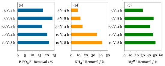 Figure 2 presents the removals of orthophosphate, ammonium, and magnesium utilizing SW1 and BDD/SS electrodes combination. Although orthophosphate removal increases with treatment time, a loss of efficiency can be noticed between 4 and 8 h assays, especially at 10 V. This loss of efficiency is likely due to the decrease in ion concentration. Ammonium removal was the most affected by the increase in the applied potential. In general, ammonium removal can be related to oxidation (Equations (1)–(3)), precipitation (Equation (4)), or evolution (Equation (5)) [,]. Since no nitrite or nitrate were detected in the solution at 10 V, Equations (2) and (3) are not likely. Also, ammonia evolution (Equation (5)) should not occur due to the low pH. For ammonium to be removed as struvite, an equimolar removal of magnesium, ammonium, and phosphate is required [], which did not occur. So, although a fraction of ammonium removal could be due to struvite precipitation, the main mechanism, specially at 10 V, was probably ammonium oxidation to atmospheric nitrogen (Equation (1)).