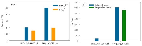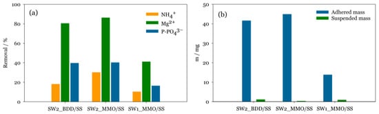 Orthophosphate was completely removed after 2 h in the Mg/SS system. Regarding ammonium removal, although it looks similar for both systems, with Mg/SS it was achieved in a quarter of MMO/SS treatment time. These results indicate that magnesium release in solution enhances the removal of both orthophosphate and nitrogen. When the adhered and suspended masses are analyzed, the difference between MMO/SS and Mg/SS systems is even more pronounced, showing the high ability of the Mg/SS system to form precipitates. Even if struvite was not obtained, which will be further discussed, different solid compounds could be formed by the association of magnesium, ammonium, and other ions like phosphate or hydroxide [,].