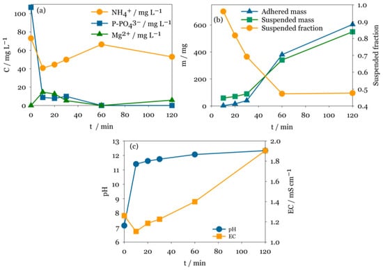 Parameters for Mg/SS assay (5 V, 2 h) throughout the experiment. (a) Concentrations of ammonium, magnesium, and orthophosphate; (b) Adhered and suspended mass; (c) pH and conductivity.