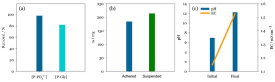 (a) Removal of orthophosphate and organic phosphorus, (b) adhered and suspended mass, and (c) variations in pH and EC during the assay performed with SW4 and MG/SS system: applied potential—5 V; time—1 h.