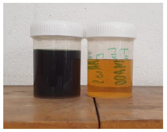 Sanitary landfill leachate before (left) and after (right) treatment with Mg/SS electrodes, at 400 mV, for 1 h.