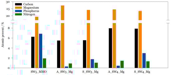 The magnesium percentage in the solid phase slightly increased with the use of magnesium electrodes, which results from the dissolution–precipitation mechanism that rules sacrificial anodes dynamics, as described above []. The atomic percentage of phosphorus was lower when using magnesium anodes, although there was a significant difference in the masses obtained: 26.2 mg for SW5 in 8 h (2% suspended), 1154.3 mg for SW3 in 2 h (48% suspended), and 397.7 mg for SW4 in 1 h (54% suspended). Thus, even with a smaller atomic percentage, phosphorus–removed mass was higher when magnesium electrodes were used, allowing higher recovery rates.