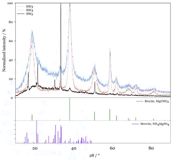 The presence of glyphosate slightly increased the carbon atomic percentage in the solids, either adhered or suspended, as can be seen when comparing SW3 and SW4, suggesting that this system is able to oxidize organic carbon and remove it as inorganic carbon. Since no other effect was observed, solids obtained from both assays should be similar. This is supported by XRD data, presented in Figure 9. When experimental diffractograms were compared to a spectra database, the major crystalline compounds identified were brucite (SW3/SW4) and struvite (SW5). Since phosphorus and nitrogen removal were detected by analyzing the wastewaters SW3/SW4, the solids produced with these elements seem to be amorphous. Also, ammonium simple salts are soluble. Thus, the association of phosphate and ammonium requires other ion(s), like magnesium, to precipitate [], which can form amorphous struvite. Nevertheless, as previously demonstrated in the literature, amorphous struvite is capable of recrystallizing when in contact with a solution containing ammonium and phosphate []. Therefore, most of the ammonium was probably oxidized to gaseous nitrogen (N2), as a small fraction was precipitated as crystalline struvite. Phosphorus removal occurred mainly as amorphous magnesium phosphates. For SW5, most of the solids obtained seem to be amorphous, with a small percentage of crystalline struvite. Although further investigation is required, the use of magnesium electrodes seems to improve phosphorus recovery, even by producing phosphorus compounds other than struvite.