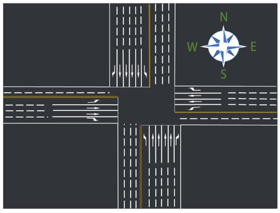 The intersection model established in this paper consists of six lanes in the north–south direction and four lanes in the east–west direction. The north–south direction has one right-turn lane, one left-turn lane, and four through lanes, while the east–west direction has one right-turn lane, one left-turn lane, and two through lanes, as shown in Figure 2. The signal plan is designed to consider the temporal and spatial differences that exist in real-world intersections, such as different time periods at the same intersection and different geographical locations of the intersections. To address these differences, two sets of action plans are proposed, namely, fixed-phase and adaptive-phase, respectively. The yellow light time during phase switching is set to 3 s to clear the vehicles at the intersection and ensure traffic safety.