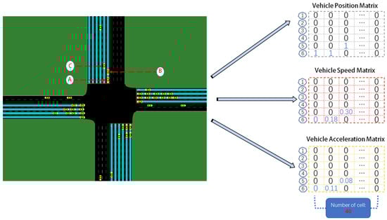 Figure 3 illustrates the intersection entrance state space at time , where the state space is composed of the entrance lanes in the four directions. Taking the north entrance lane as an example, the position matrix represents the vehicles’ positions at , , and away from the stop line on the lane, corresponding to vehicles A, B, and C. The velocities of these three vehicles are , , and 5 m/s, respectively. Following normalization with respect to the intersection speed limit and speed factor, these velocities transform into 0, 0.18, and 0.30. The accelerations of the vehicles are , , and . Upon normalization, accounting for the maximum acceleration and deceleration, these values become 0, 0.11, and 0.08, respectively. The information pertaining to vehicle speed, acceleration, and deceleration is subsequently inserted into the appropriate speed and acceleration matrices based on the vehicle’s location in the position matrix.