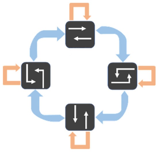 The fixed-phase action space for the intersection control is defined in this paper, where denotes north–south through movement, denotes north–south left turn, denotes east–west through movement, and denotes east–west left turn. The right-turning vehicles are not regulated by the traffic signal and can make a turn when there is no conflict with other vehicles. The schematic diagram of the fixed-phase action space is depicted in Figure 4.