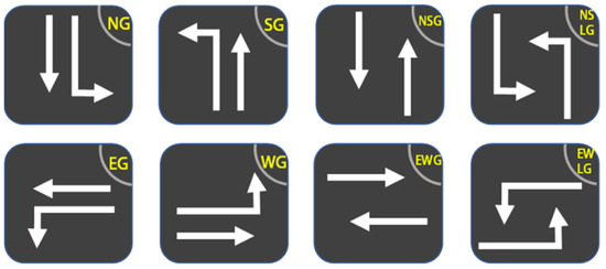 Compared with the fixed-phase sequence, the adaptive-phase sequence involves a more intricate action space. Nonetheless, the agent’s decision-making process becomes more flexible, allowing it to select the optimal action based on the intersection’s state. The action space of adaptive-phase sequence comprises for northbound through and left turns, for southbound through and left turns, for north–south through, for north–south left turns, for eastbound through and left turns, for westbound through and left turns, for east–west through, and for east–west left turns. Likewise, right-turning vehicles are permitted to turn only if they do not impede the passage of through or left-turning vehicles. The adaptive-phase action space is illustrated in Figure 5.