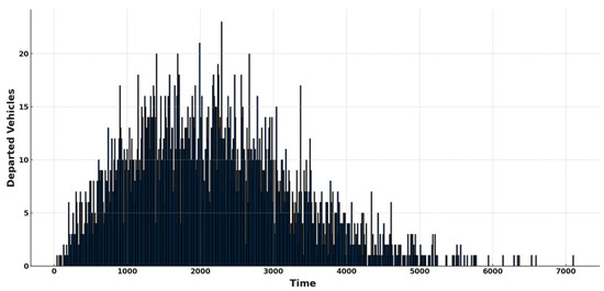 After a thorough comparison of the DQN [43], D3QN, and the discretized ASAC (adaptive soft actor–critic) algorithms [44], this study ultimately decided to employ the D3QN algorithm based on its convergence rate and optimization effectiveness. As demonstrated in Figure 6, this study established a two-hour peak traffic period, utilizing a Weibull distribution for vehicle generation, to assess the intelligent agent’s decision-making capabilities under varying traffic volumes. According to the results shown in Figure 7, throughout 300 iterations of training, the D3QN algorithm exhibited the strongest convergence and resilience against traffic volume fluctuations. This algorithm is developed by incorporating the dueling DQN [45] and double DQN [46] into the traditional DQN algorithm, addressing the problem of the traditional DQN’s complete reliance on action value for state prediction and the overestimation issue in value estimation. Compared with the discretized ASAC algorithm, the D3QN further enhances decision optimization for the agent, thereby improving the optimization effectiveness for signalized intersections.