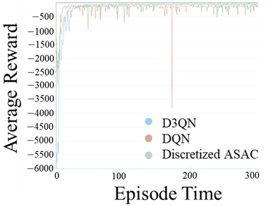 Comparisons between the D3QN, DQN, and discretized ASAC on average reward.