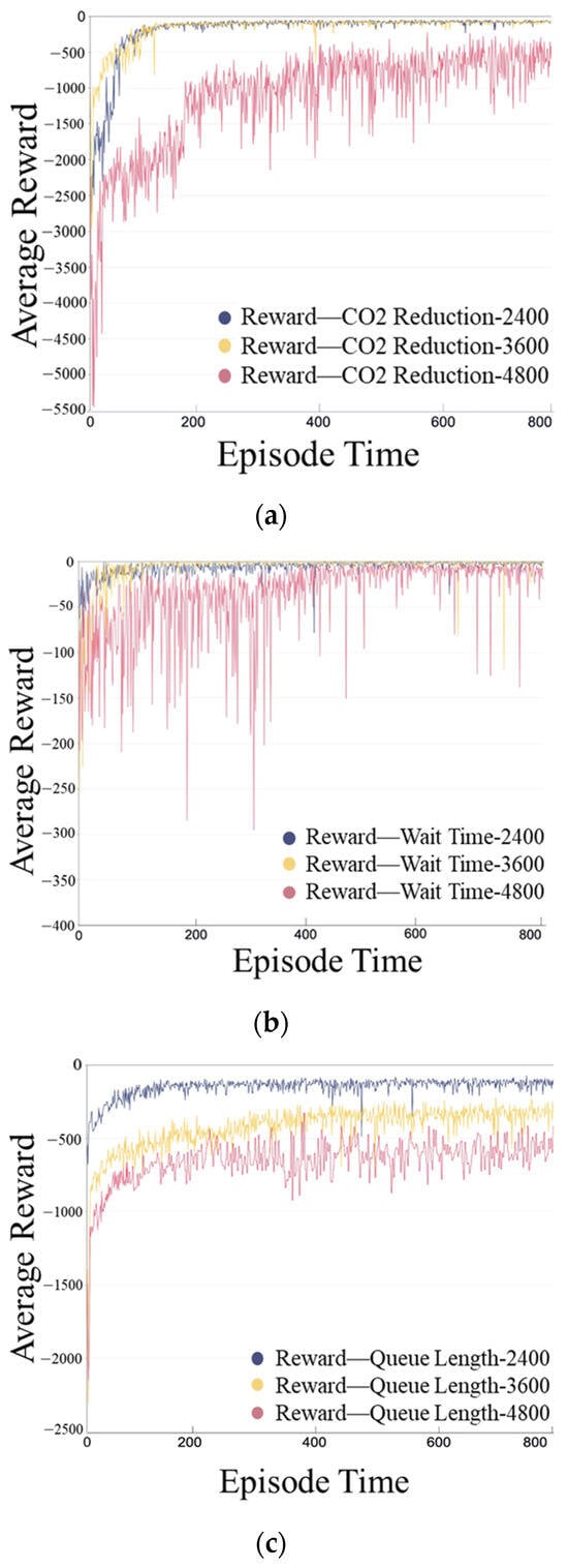 where represents the cumulative CO2 emissions of the intersection entrance at time , represents the cumulative CO2 emissions of the intersection entrance at time , represents the cumulative waiting time at the intersection entrance at time , and represents the cumulative waiting time at the intersection entrance at time . After multiple experiments, the values of and were determined to be −2 and −1, respectively, while the values of and were both set to 0.9.