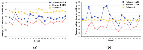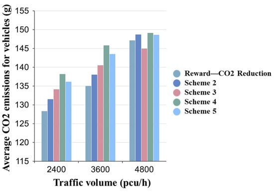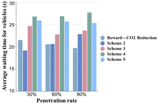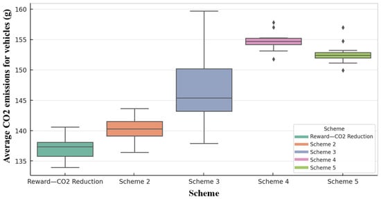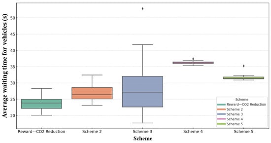 As shown in Figure 15 and Figure 16, the Reward—CO2 Reduction scheme introduced in this study achieves average CO2 emissions of 137.11g per vehicle during traffic incidents at intersections. This emission level is 2.07% less than that of Scheme 2, 6.57% less than that of Scheme 3, 11.37% less than that of Scheme 4, and 10.13% less than that of Scheme 5. In addition to exhibiting superior optimization performance in terms of average CO2 emissions per vehicle, the scheme proposed in this paper also demonstrates a reduction in average vehicle waiting time during traffic accidents compared with other schemes. Specifically, it shows an 11.31% decrease compared with Scheme 2, a 15.67% decrease compared with Scheme 3, a significant 34.12% decrease compared with Scheme 4, and a 24.58% decrease compared with Scheme 5. Additionally, compared with other deep reinforcement learning algorithms used in Scheme 2 and Scheme 3, the proposed scheme demonstrates a relatively tight data distribution, indicating more stable performance under varying conditions and exhibiting robustness.