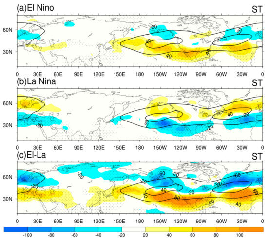 - Straus, D.M.; Shukla, J. Variations of midlatitude transient dynamics associated with ENSO. J. Atmos. Sci. 1997, 54, 777–790. [Google Scholar] [CrossRef]